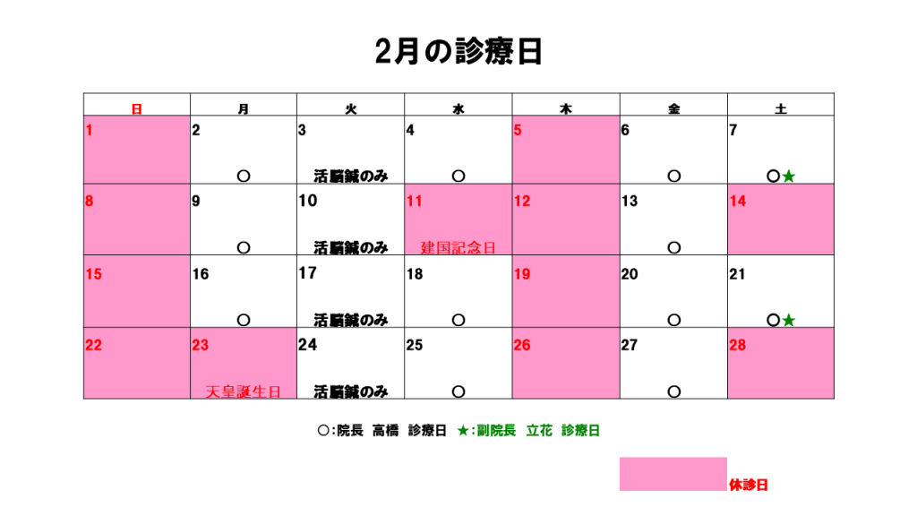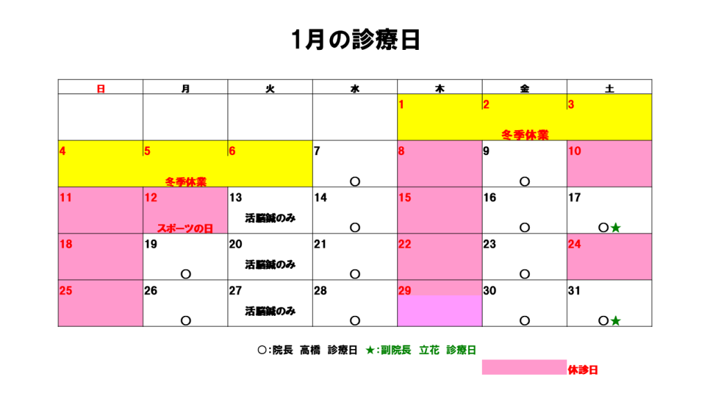 1月・2月の診療日 2025年12月11日 最終更新日時 : 2025年12月11日 りゅうえい治療院 【冬季休暇のお知らせ】りゅうえい治療院、並びになかよし漢方堂は12月30日(水)から1月6日(火)まで冬季休暇を頂戴いたします。1月7日(水)より通常通り営業いたします。どうぞよろしくお願いいたします。